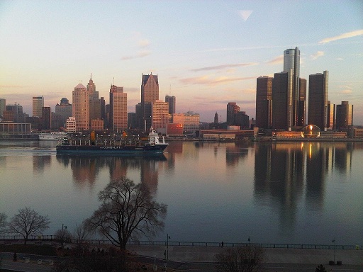 I was struck by this photo of the Detroit skyline taken from across the river in Windsor. The river looks so calm when I’m used to seeing it wind swept and turbulent – a rough river for a rough city.