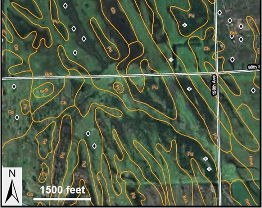 The Bearden soil is found on the “ridges” that appear as lighter streaks in the aerial photo. The Perella soils, often found in wetlands, are wetter and appear darker in the aerial photo compared to the Bearden. More information is available regarding these soils at NRCS Official Soil Series Descriptions