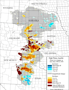 Spray irrigation in north Texas is mostly supported by groundwater from the Ogallala Aquifer. In the second figure, the drawdown-recharge map produced by the USGS shows areas of depletion, recharge and no significant change (click on the image for a larger view). The map was created from data ending in 1995, so it’s somwhat outdated.