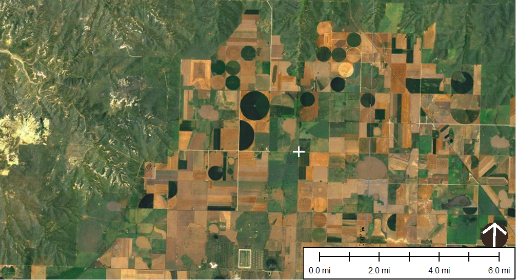 In the top figure, the aerial photo east of Amarillo, TX, the circular shapes are center-pivot spray irrigated croplands. Typical crops are cotton, sorghum, and corn. The green area to the north and west is grassland. The partitioning of the land into these two usages comes with recognition of the limitations of site specific soil and landscape conditions. The whitish area to the west is an actively eroding soil surface.