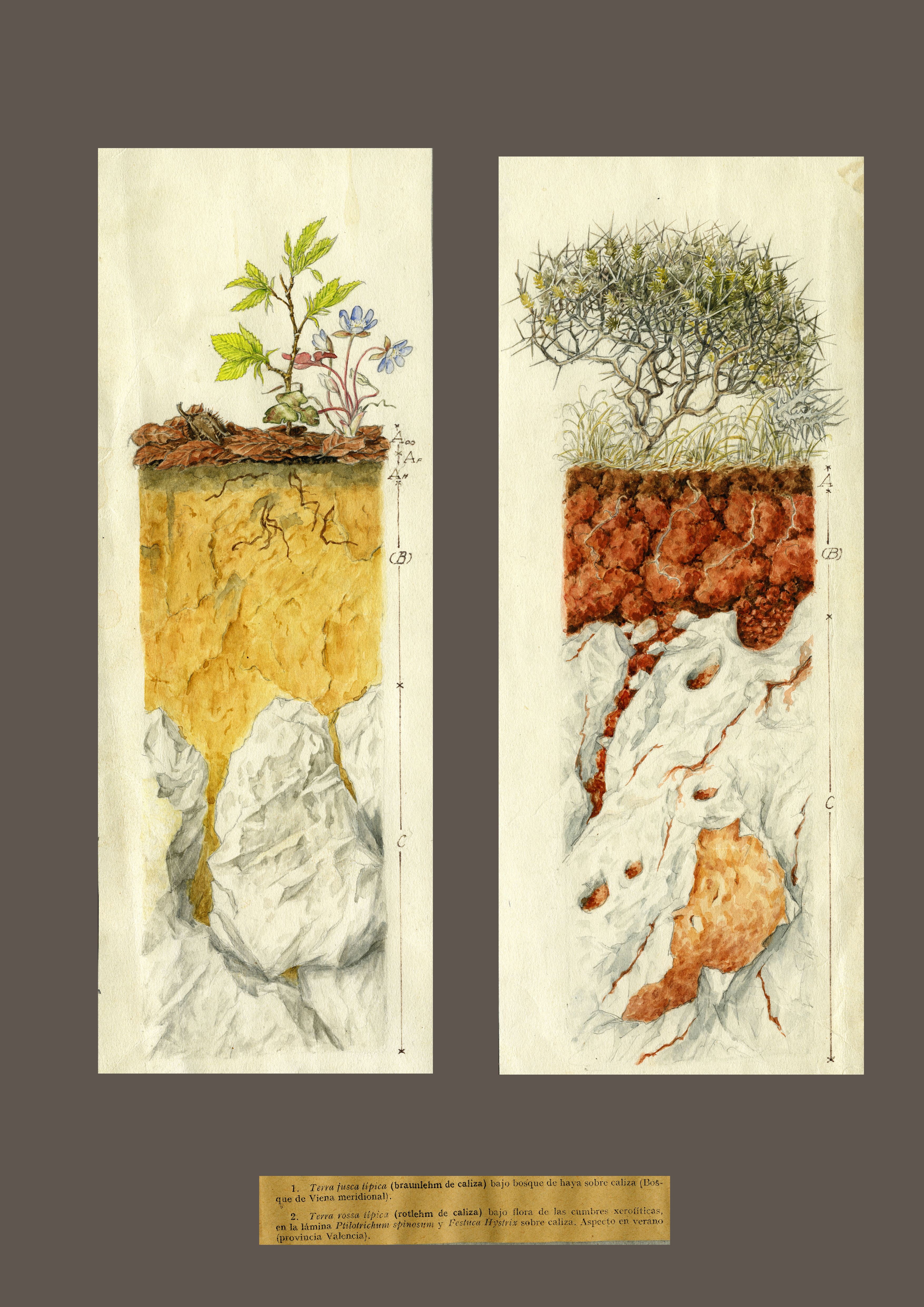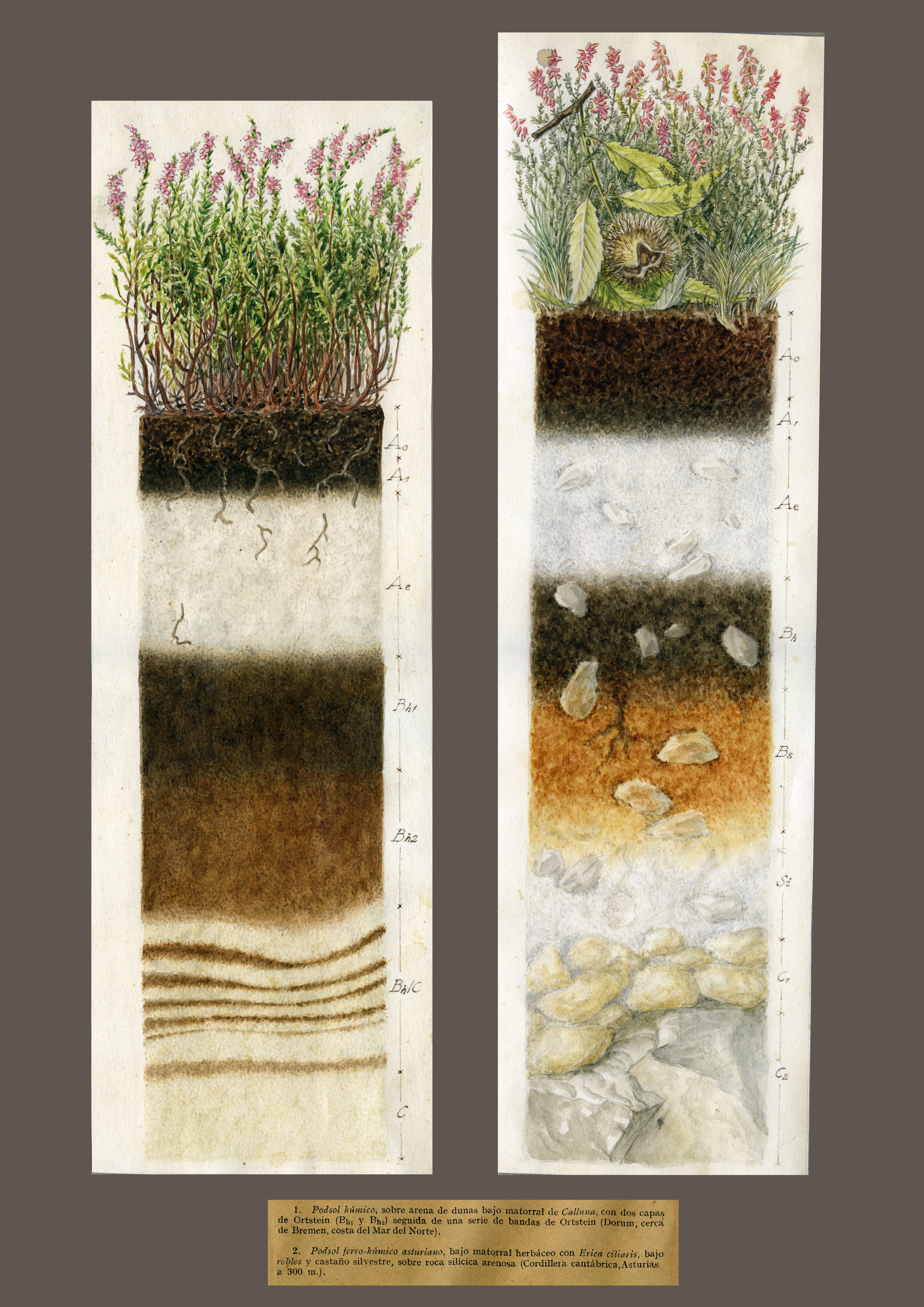 Kubiena’s name is on the book but the painting was actually done by Gertrude Kallab Purtscher and Anton Prazak. Kubiena apparently interpreted the profile morphology, sketching and demarcating horizons, and collaborated with the two illustrators on the color renderings.