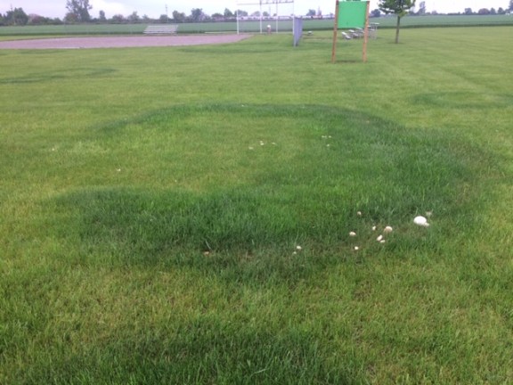 As our three-year old chocolate-golden Labrador mix looks happiest when he’s running, we try to get him out to a park once or twice a day. While he’s chasing noisy killdeer and attacking discarded plastic water bottles, I have a chance to look at the land and sky and assess the progress of the new growing season. In springtime, at one of the parks near our home in Lenawee County, Michigan, strange dark green circles emerge in the turf grass, persisting into the summer. The circles consist of darker, greener, more robust grass surrounded by shorter, lighter green grass. Some of the circles are entirely closed rings while others are incomplete and form crescent shapes. Some double up as overlapping hoops. They vary in diameter with some upwards of about twenty-five feet (8m), or so. Most are a bit smaller.