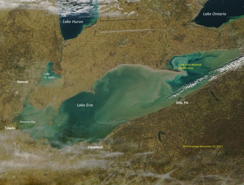 A wetter than average year in 2021, coupled with insufficient areas planted with cover crops probably contributed to higher than average sediment loads in lakes and rivers. Data recorded at Toledo Express Airport and available at Weather Underground indicate two days of heavy rain: 0.88 inch on December 6 and 0.87 inch on December 11, within two weeks of the date the above MODIS image was shot. The suspended sediment shown in Lake Erie and Lake St. Claire strongly contrasts with the darker, more transparent water in Lakes Huron and Ontario.