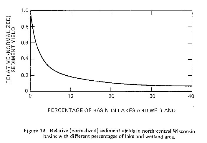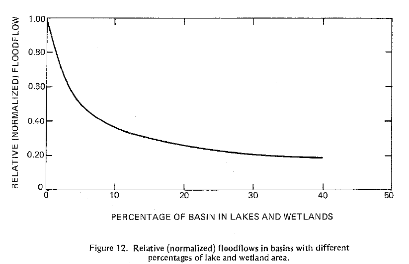 Building on Conger’s work, USGS hydrologist Richard P. Novitzki published Hydrology of Wisconsin Wetlands (1982) and related watershed wetland and lake area to flood flows and sediment yields. Graphed in Figure 12, and Figure 14 (Novitski, 1982), data show a substantial reduction in flood flows and sediment load, respectively, when watershed lake and wetland areas approach 10 percent.