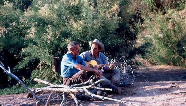 Luna Leopold (hat and six-string) with physicist Ralph Alger Bagnold c. 1970 (source: USGS).